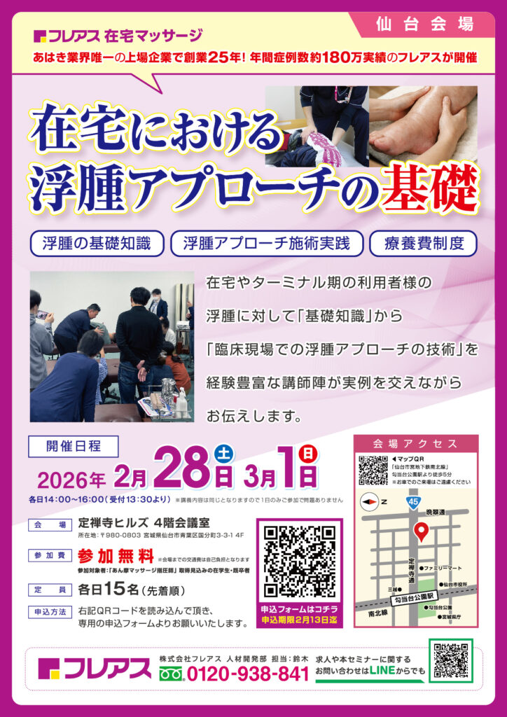 在宅における浮腫アプローチの基礎を学べるセミナーを仙台会場にて開催いたします!